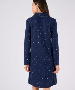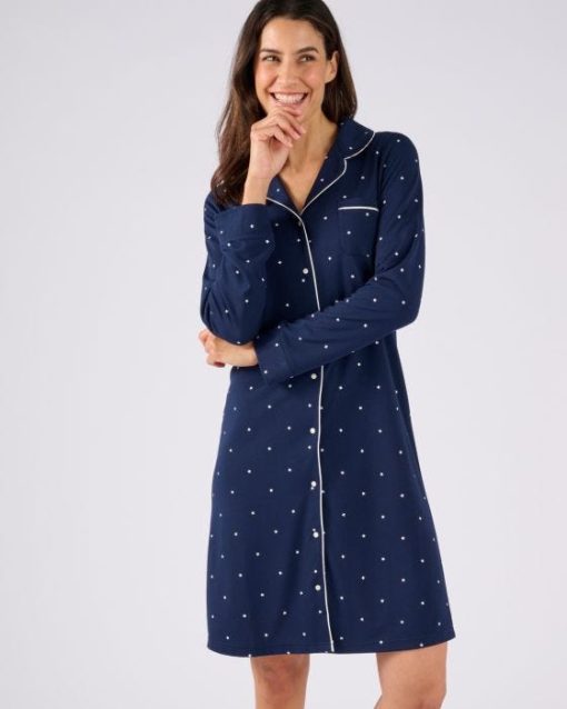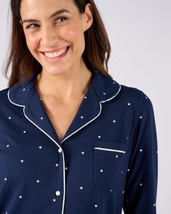 Sous le charme de cette chemise de nuit chaude qui vous promet des nuits étoilées grâce à son bel imprimé ! En maille jersey labellisée Thermolactyl *fabriquée à 70% en polyester recyclé, elle réchauffe vos nuits en douceur. On aime la modernité de sa forme liquette, avec un joli col tailleur, une poche poitrine, une patte entièrement boutonnée et des finitions soignées par biais satiné. Vous retrouverez la version pyjama sur notre site. Longueur de cette chemise de nuit femme : 97 cm environ.