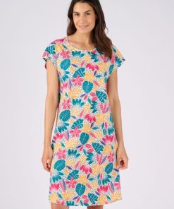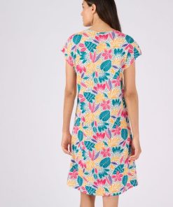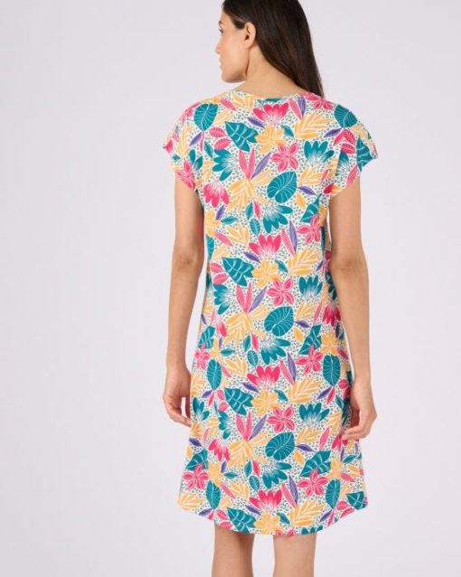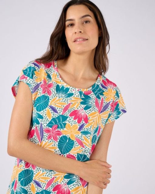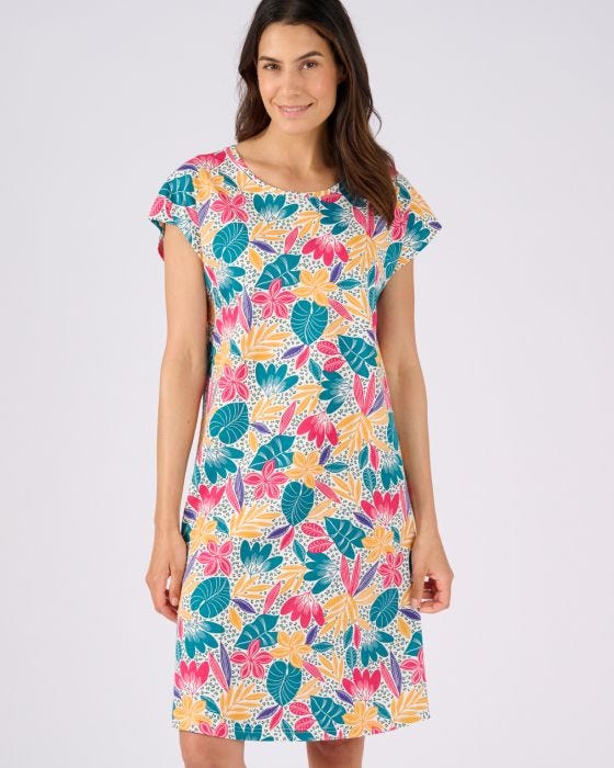 Un imprimé coloré à l’inspiration tropicale joyeuse pour cette robe de chambre pur coton. Sa maille jersey est souple, très agréable à porter. Elle s’enfile facilement puisque sa forme croisée, bien enveloppante, se ferme par une ceinture à nouer. Un passepoil uni souligne avec soin la parmenture et le bas des manches longues. Pour composer un ensemble de nuit complet, vous pourrez associer cette robe de chambre imprimée au pyjashort et au pantalon de pyjama coordonnés, à retrouver sur ce site. Longueur de ce peignoir femme : 112 cm environ. ŒKO-TEX® STANDARD 100 CQ1194/1 – IFTH.