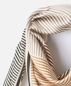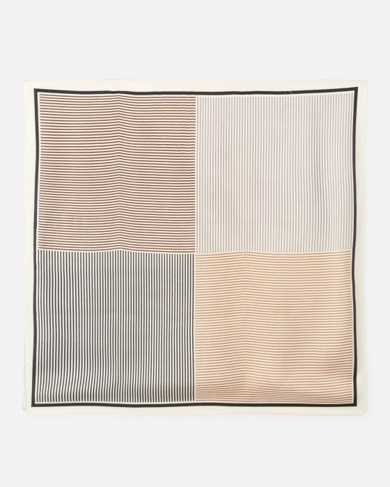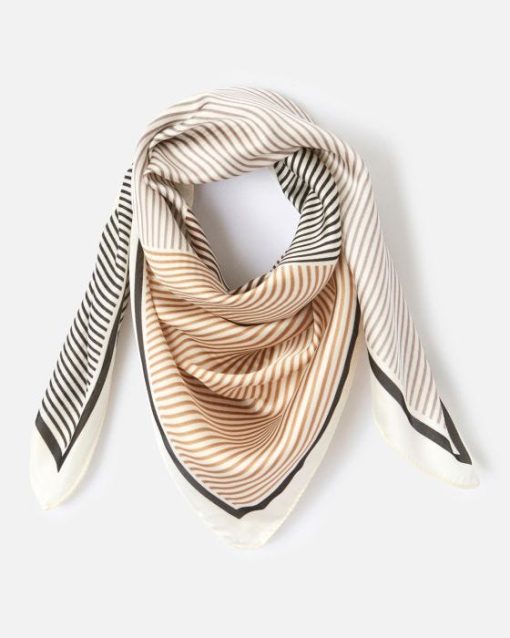 Léger, polyvalent et facile à porter, ce foulard se glisse aussi bien autour du cou qu’en accessoire de sac. Il réinvente le classique avec son motif de rayures graphiques. Dimensions du foulard carré femme : 70 x 70 cm.