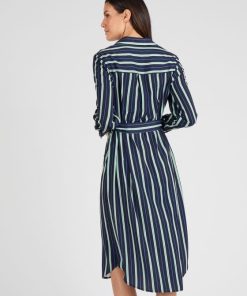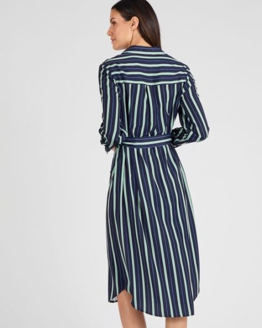 Voilà une petite robe-chemisier qui séduit toutes les silhouettes. Avec son tissu rayé fond marine, elle allonge la ligne et s’offre un petit côté chic qu’on adore. Sa coupe est parfaite : un petit col pointu, des manches longues à poignets boutonnés, un pli sous empiècement dos offrant juste ce qu’il faut d’aisance et une base arrondie qui modernise son style. Une ceinture lien souligne délicatement la taille. Vous pourrez aussi la remplacer par une jolie ceinture cuir, histoire de varier les looks ! Longueur de cette robe rayée toute boutonnée : 112 cm environ.