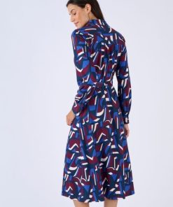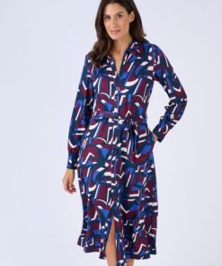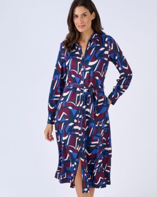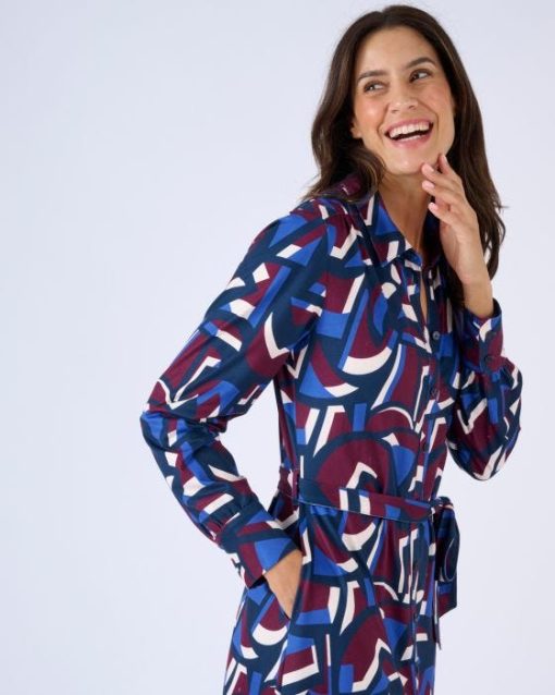 Un imprimé graphique, comme un joli tableau abstrait, fait tout le chic et le charme de cette robe chemisier… Une petite pépite du dressing