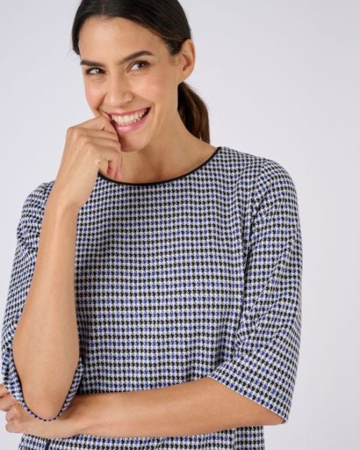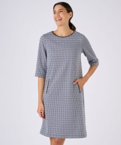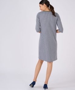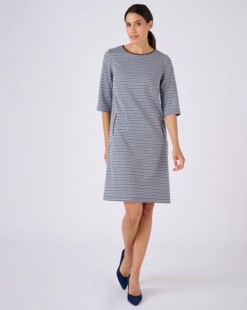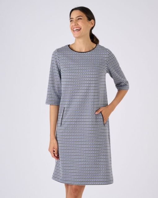 Elégance classique d’un jacquard pied-de-poule et modernité audacieuse d’une coupe tout en sobriété… Voilà ce qui fait le charme de cette robe milano. On la sophistiquera avec une paire de chaussures à talon, on jouera la tendance avec une paire de boots ou on accentuera son chic-décontracté en optant pour une paire de baskets. Son encolure bateau dégage joliment le décolleté. Le petit détail que l’on aime : les 2 poches verticales soulignées d’un passepoil. Pinces poitrine. Manches 3/4. Longueur de cette robe pied-de-poule : 94 cm environ.