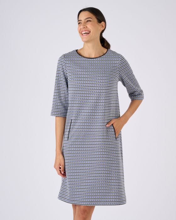 Un joli pied-de-poule au chic intemporel pour cette robe en maille milano, à la coupe toute simple mais qui fait assurément son petit effet !