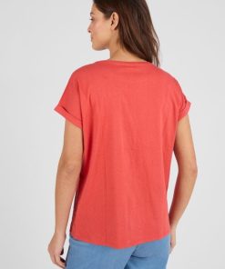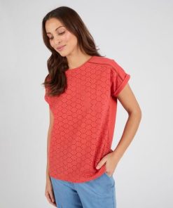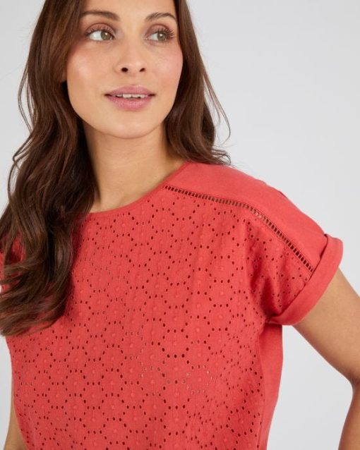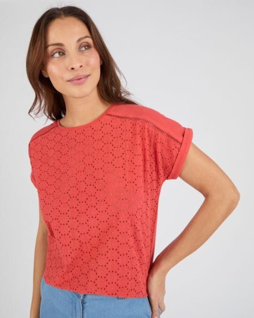 Ce t-shirt bi-matière allie l’élégance de la broderie anglaise en coton mélangé sur le devant à la douceur d’un dos en maille jersey pur coton. Ses manches courtes non rapportées, sublimées par un jeu de jours échelles et des revers délicats, ajoutent une touche de féminité. Facile à porter et à associer, il devient un incontournable du dressing estival. Longueur du tee-shirt brodé 61 cm environ.