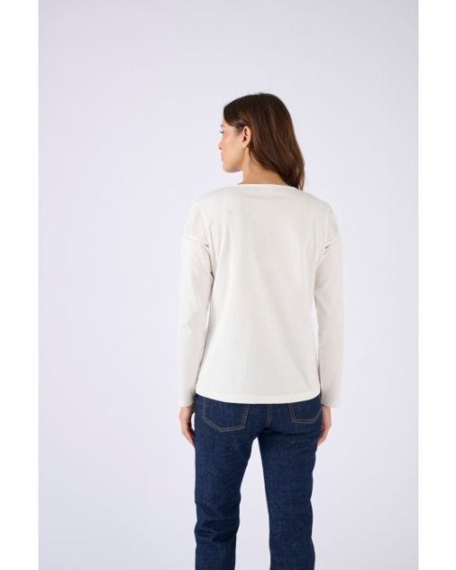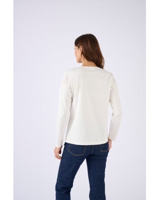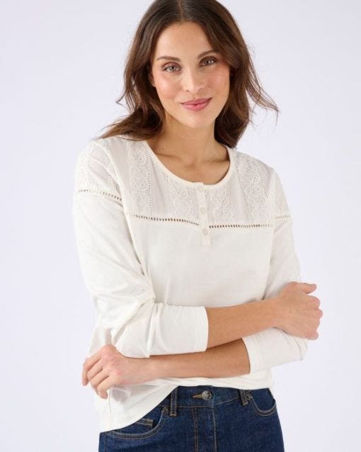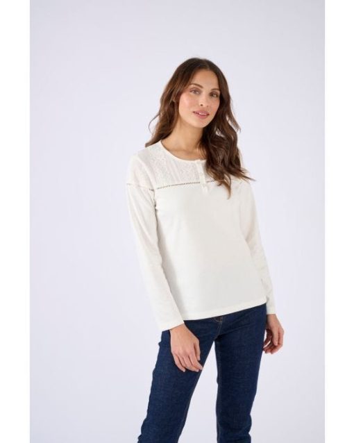 Ce t-shirt bi-matière, à l’esprit bohème, se distingue par sa maille jersey en pur coton issu de l’agriculture biologique, douce et confortable. L’empiècement poitrine et le haut des manches en popeline broderie anglaise ajoutent une touche élégante, parfaite pour celles qui aiment les détails raffinés. Le col rond, subtilement rehaussé d’une patte de boutonnage, donne un twist chic et contemporain à ce basique réinventé. Un incontournable de la saison pour un look à la fois décontracté et résolument tendance, à mixer avec toutes vos pièces favorites. Longueur du tee-shirt brodé femme 61 cm environ.