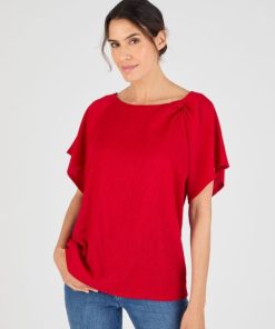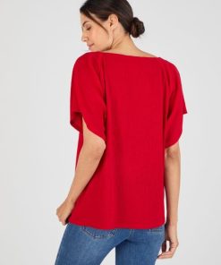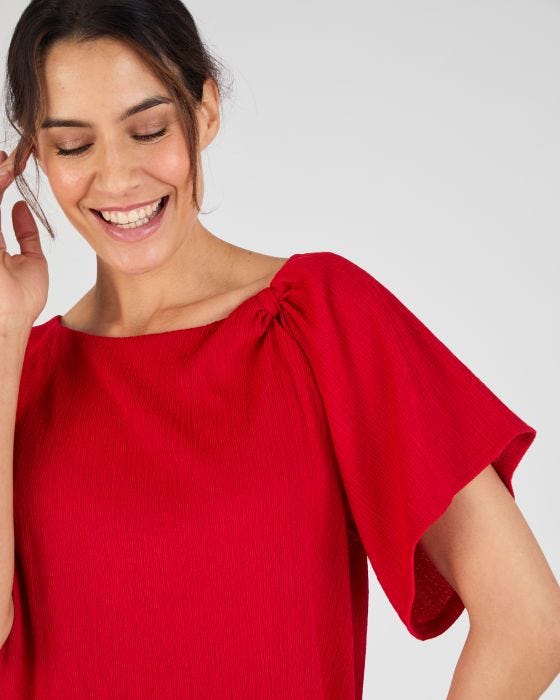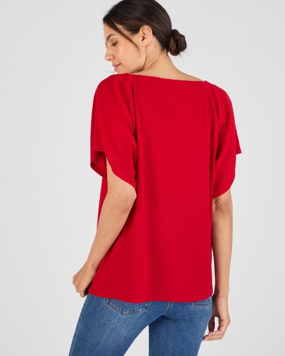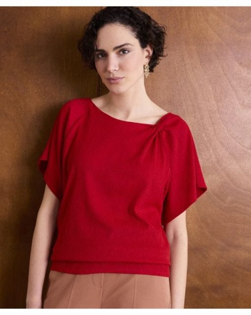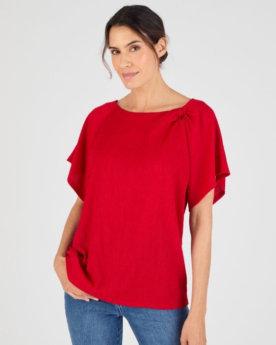 Découvrez notre t-shirt en maille texturée effet froissé, que vous allez adorer grâce à sa subtile originalité. Son col bateau effet drapé, sublimé par un nœud fantaisie, apporte une touche féminine à votre tenue. Les manches raglan effet volanté ajoutent du mouvement et de la légèreté à ce tee-shirt. Idéal pour une allure chic au quotidien, ce t-shirt s’associe facilement à un jean ou une jupe pour un look tendance en toute occasion. Longueur du t-shirt femme 61 cm environ.
