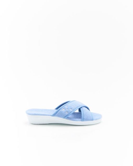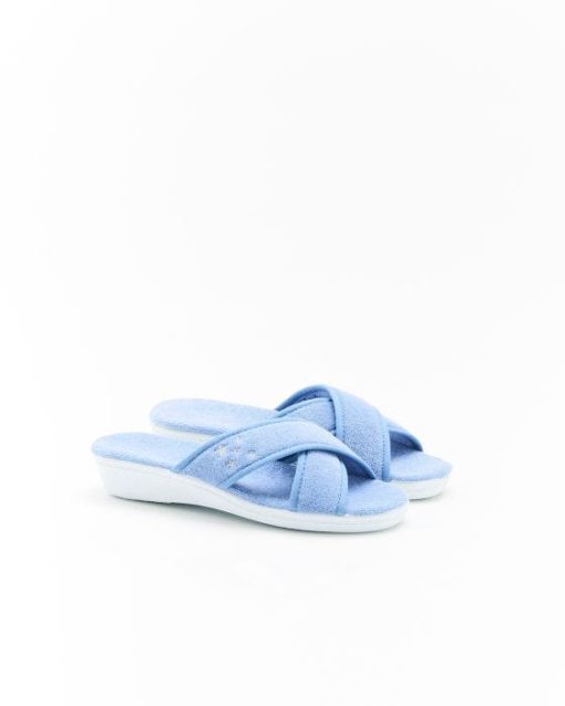 La paire indispensable quand il fait chaud ? La mule ouverte bien-sûr ! Cette saison, on adopte cette paire de mules féminines et colorées qui affiche une jolie broderie étoilée sur le côté. Leurs lanières croisées offrent un bon maintien du pied et leur talon de 3 cm assure un confort optimal. En éponge, ces mules compensées confortables sont douces et très agréables à porter. Découvrez notre collection de chaussons parfaits pour l’été sur notre site.