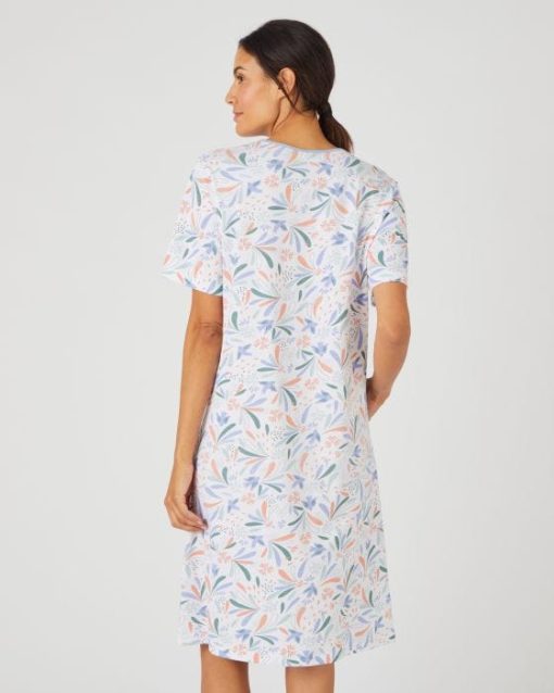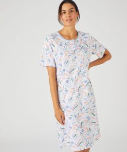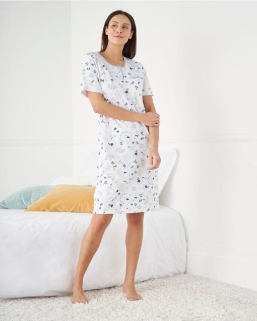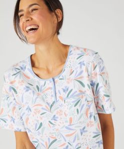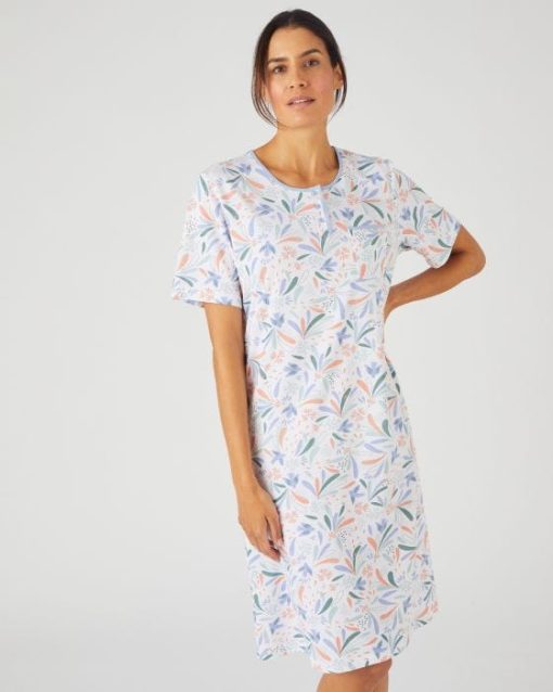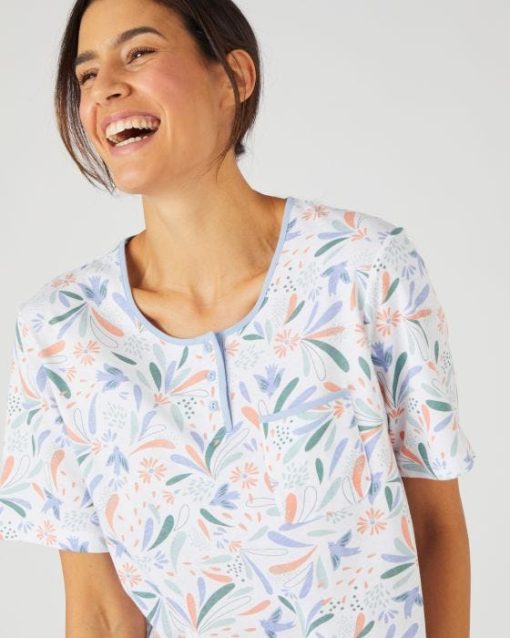 Souplesse et confort d’une maille jersey en pur coton peigné déclinée sur une chemise de nuit à l’imprimé frais. Encolure ronde fermée par une patte de boutonnage (3 boutons). 1 poche poitrine. Manches courtes. Finition biais contrasté soulignant l’encolure et le haut de la poche. Longueur de la chemise de nuit femme 97 cm environ. OEKO-TEX® STANDARD 100 CQ1194/1 – IFTH.