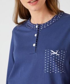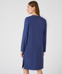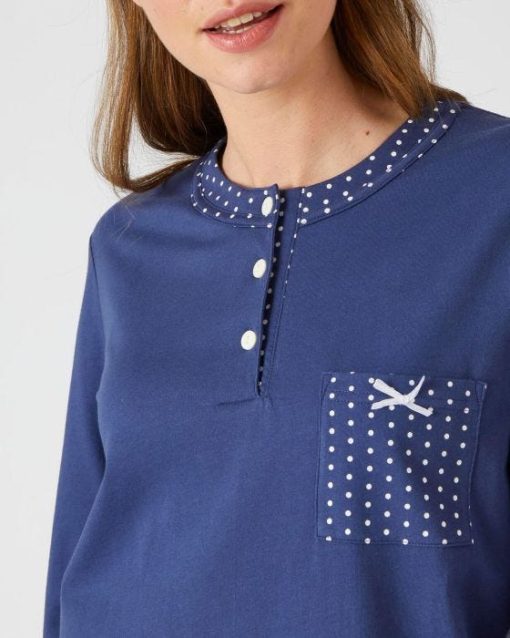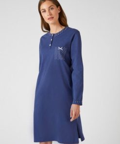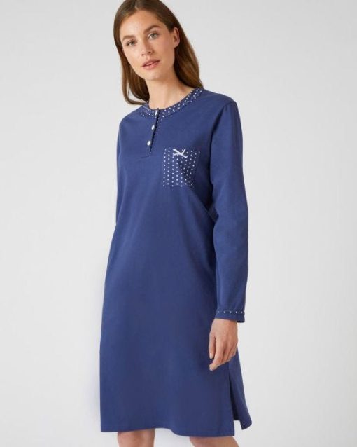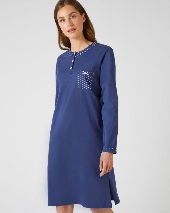 Souple et douce sur la peau, sans souci d’entretien. Encolure arrondie. Patte de boutonnage 3 boutons contrastants, 1 poche poitrine imprimée plumetis agrémentée d’un petit noeud. Fente côtés. Longueur 95 cm. Existe en longueur 120 cm sur notre site. OEKO-TEX® STANDARD 100 CQ1194/1 – IFTH.