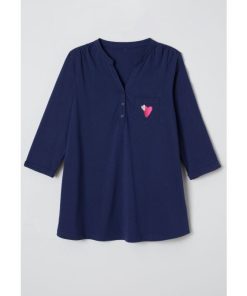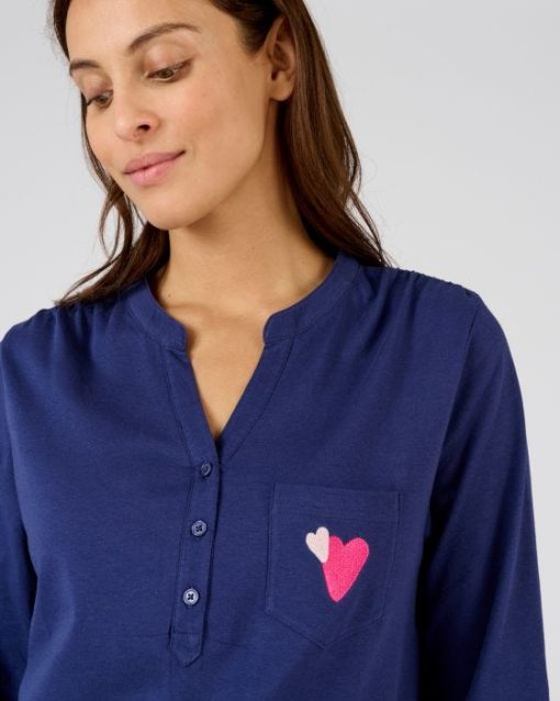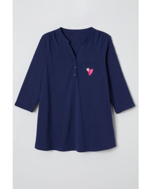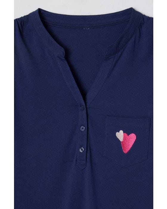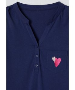 On craque pour ce T-shirt de pyjama femme au décolleté tunisien fermé par une patte boutonnée, aux épaules froncées, aux manches 3/4 à revers, à la jolie poche poitrine brodée et à la base arrondie. Il dépoussière le traditionnel haut de pyjama et apporte une touche de féminité aux tenues de nuit. On adore sa maille jersey en pur coton peigné, souple et agréable à porter. Pour finaliser votre nouvel ensemble préféré, piochez le bas de pyjama coordonné ! Toute la collection est à retrouver sur notre site. Longueur de ce haut de pyjama actuel : 69 cm environ. ŒKO-TEX® STANDARD 100 CQ1194/1- IFTH.