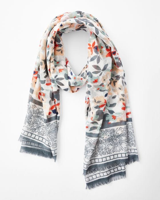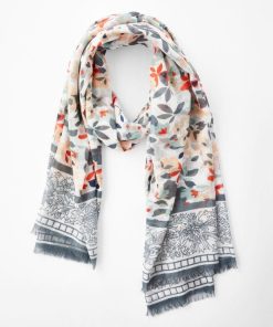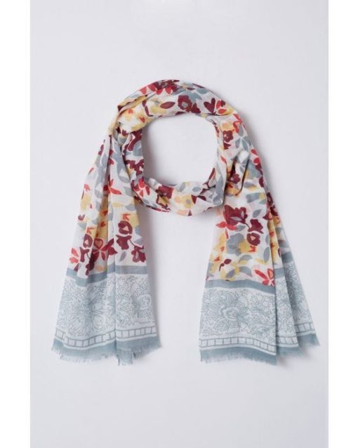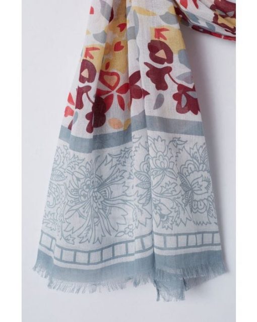 Un foulard dans un joli imprimé fleuri bordé d’un cadre à motifs fantaisie. Agréable à porter dans une matière fluide mélange coton et Lyocell. Dimension du foulard femme 100 x 170 cm environ. Accessoire femme.
