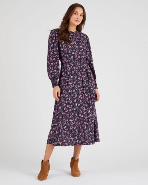 Une robe-chemise conçue dans une viscose moins gourmande en eau qu’une viscose classique…on apprécie !Son tissu est léger, doux et fluide, tellement agréable sur la peau… Son imprimé sur fond marine a beaucoup de chic. Toute boutonnée, vous pouvez aussi la porter un peu ouverte pour dévoiler le genou : très sympa avec une paire de baskets blanches. Si vous préférez prendre de la hauteur, une paire de bottes à talon sera parfaite. Fantaisie de smocks aux épaules et au bas des manches longues. Col rond. Pinces poitrine. Ceinture lien à nouer. Longueur de la robe imprimée : 117 cm environ.