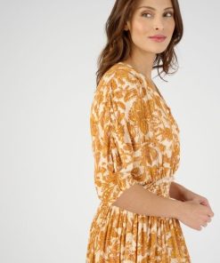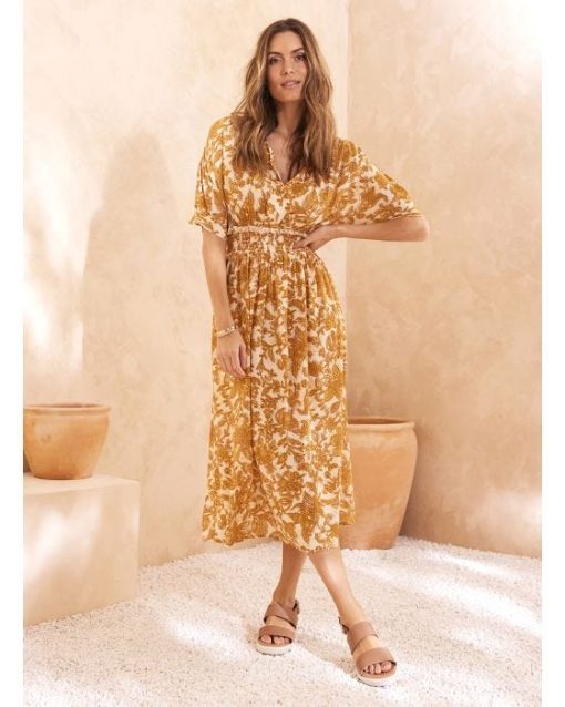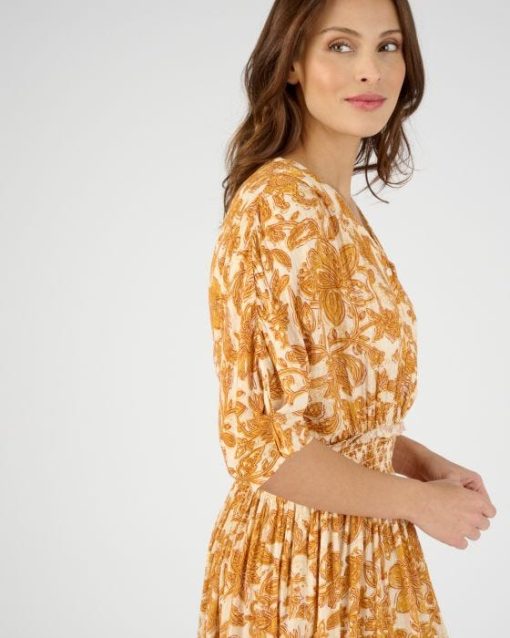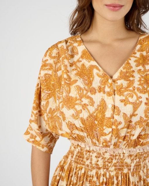 Esprit bohème chic pour cette robe qui se distingue par sa longueur actuelle. Parfaitement équilibrée par sa taille à smocks, elle définit en toute féminité votre silhouette. Sa coupe manches raglan avec manches courtes soulignées d’un pli piqué et fronces aux épaules assure un grand confort. On aime aussi son tissu fluide, souple et léger en viscose reliéfé idéal en été. Col V. Boutonnage milieu devant jusqu’à la taille. Longueur de la robe femme imprimée 122 cm environ.