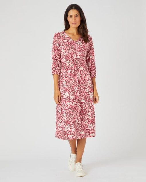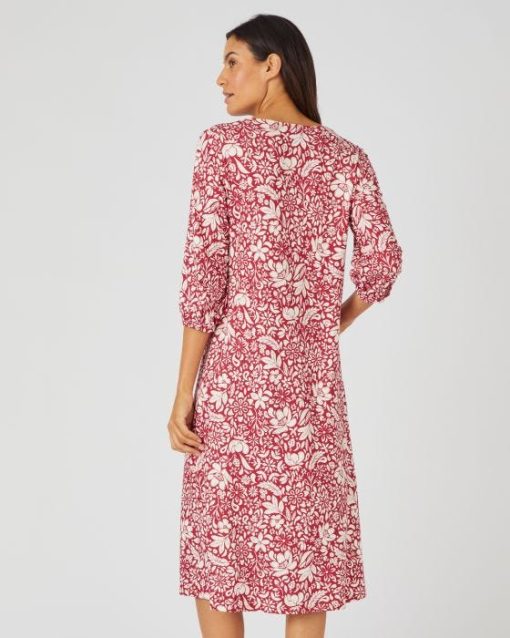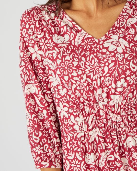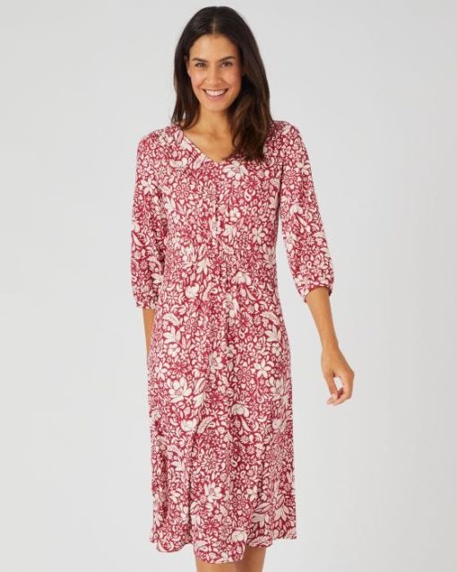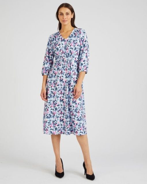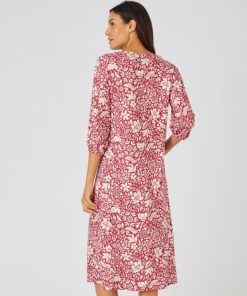 Douce et confortable, la robe s’accorde au rythme de la saison avec sa maille chaude et souple au toucher peau de pêche composée à 92% en polyester recyclé. Elle contient aussi de l’élasthanne qui offre un confort supplémentaire au porté et une belle aisance. C’est la robe femme facile à vivre et agréable à porter, parfaite pour accompagner les journées plus fraîches à la mi-saison. Sa fantaisie smockée à la taille marque joliment la ligne, apporte de l’aisance et surtout affiche un style moderne. Col V. Empiècements épaules soulignés de fronces. Manches 3/4 froncées à poignets boutonnés. Longueur de la robe imprimée femme 107 cm environ.