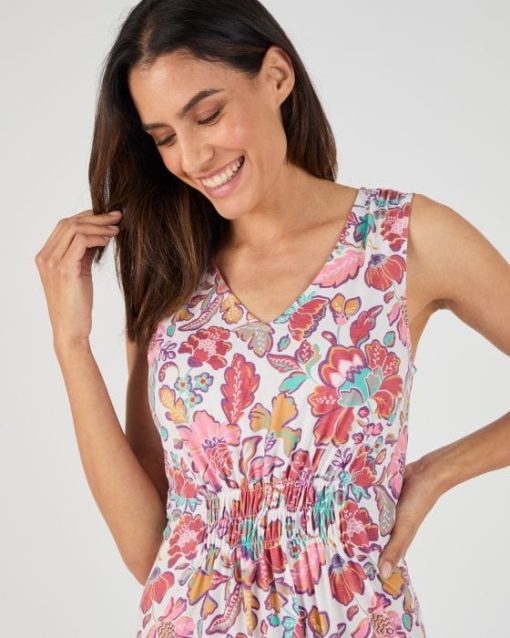 Votre petite robe d’été, celle que vous emporterez partout, que vous glisserez dans la valise des vacances est peut-être celle-ci ! Elle coche toutes les bonnes cases du style, de la féminité et du confort. Sa maille stretch évacue de façon optimale l’humidité et bénéficie d’une neutralisation des odeurs. Un jeu de smocks à la taille apporte de l’aisance tout en masquant discrètement les petites rondeurs (mais chut… ça c’est un secret !). Un large volant à la base donne à cette robe sans manches un mouvement très féminin. Quant à sa maille extensible, vous laissant libre de vos mouvements, c’est juste un bonheur à porter ! Longueur de cette robe fleurie : 122 cm environ.