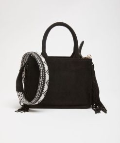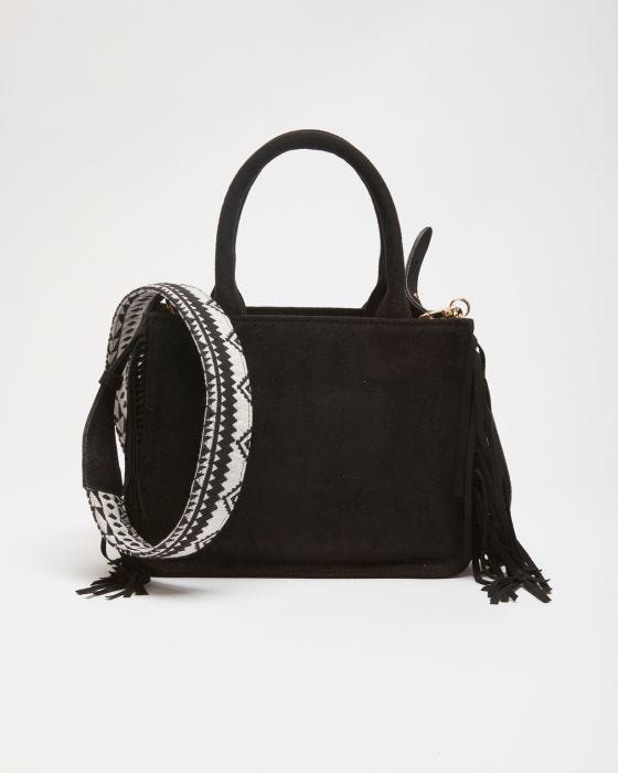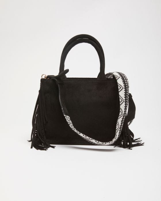 Un sac décliné dans une matière d’aspect suédée soulignée d’un jeu de franges sur les côtés. Anse pour un porté main et bride contrastée à motifs ethniques réglable par boucle et amovible par mousqueton pour un porté bandoulière. Fermé par glissière. 1 poches intérieure. Doublé. Dimension du sac femme 18,5 x 23,5 cm environ. Accessoires maroquinerie femme.