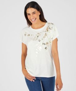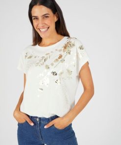 Ce t-shirt maille jersey en coton et modal est idéal pour celles qui recherchent une pièce originale, alliant douceur et éclat. Découvrez ce tee-shirt orné d’un motif végétal en sequins, un mariage parfait entre confort et glamour. Ce t-shirt revisite la tendance avec une touche scintillante qui illumine votre style. A porter avec un pantalon en lin large ou une jupe plissée pour un look city pile dans la tendance. Manches courtes forme T. Col rond. Longueur du tee-shirt femme à sequins 61 cm environ.