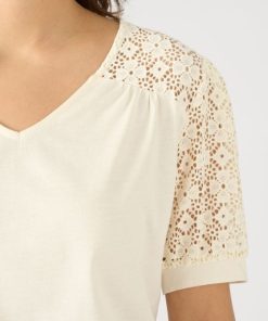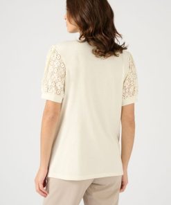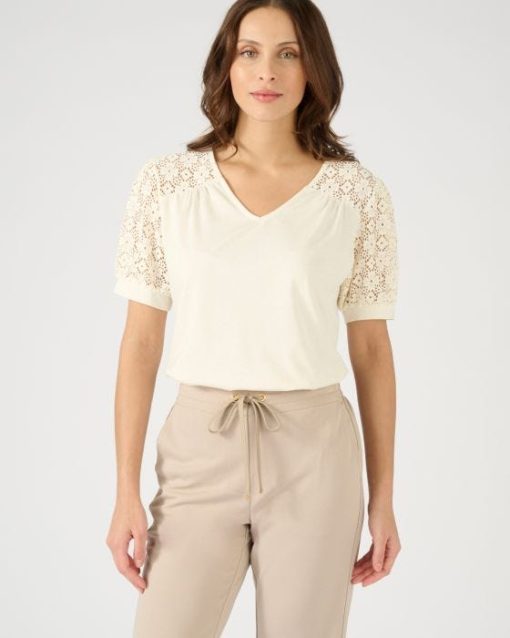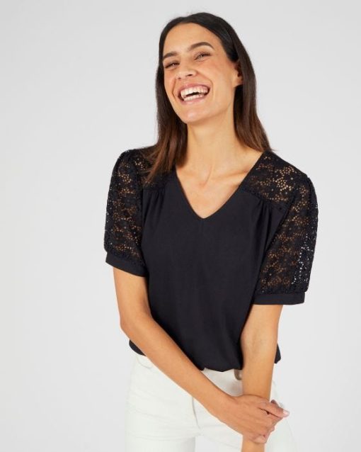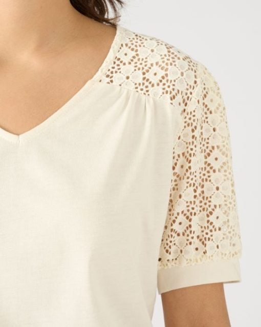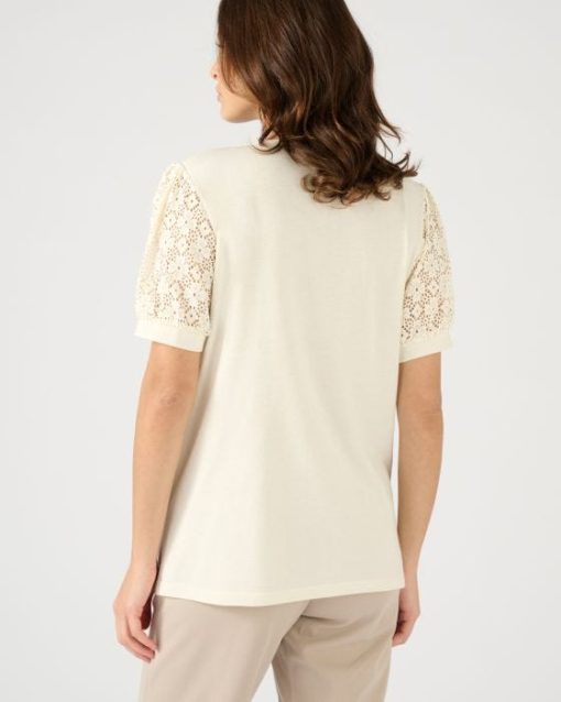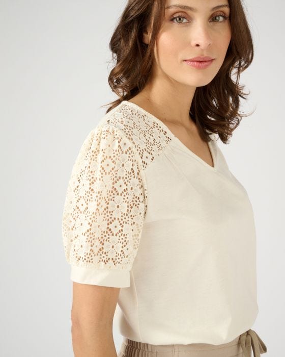 Des empiècements épaules et des manches ballon en macramé : les bons code du chic actuel pour un tee-shirt qui joue les néo romantiques ! Comment ne pas craquer ?