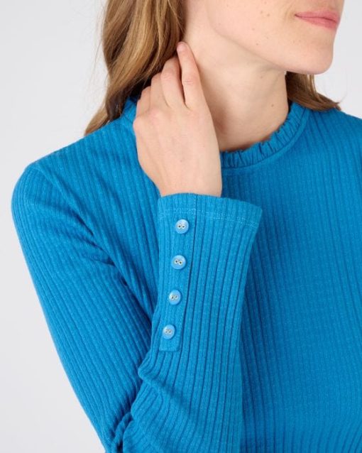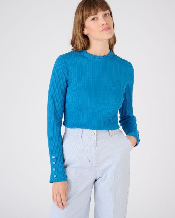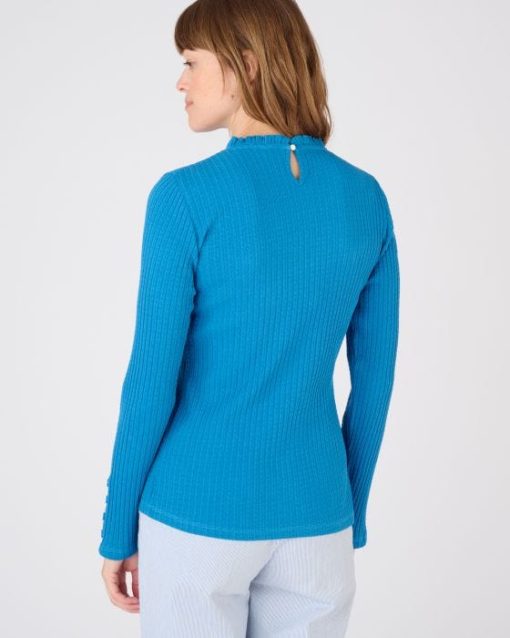 Sous le charme, un rien romantique, de ce tee-shirt à col volanté. Sa maille joue un bel effet gaufré, et se fait toute douce grâce à une composition en pur coton. Le petit plus : un effet de patte boutonnée au bas des manches longues. Ce tee-shirt uni est une bonne base de notre dressing car autant avec un jean qu’avec un pantalon city, une jupe évasée ou droite, il compose toujours une tenue élégante et facile à vivre. Fermé par bouton et lichette au dos. Longueur du T-shirt femme : 61 cm environ.