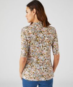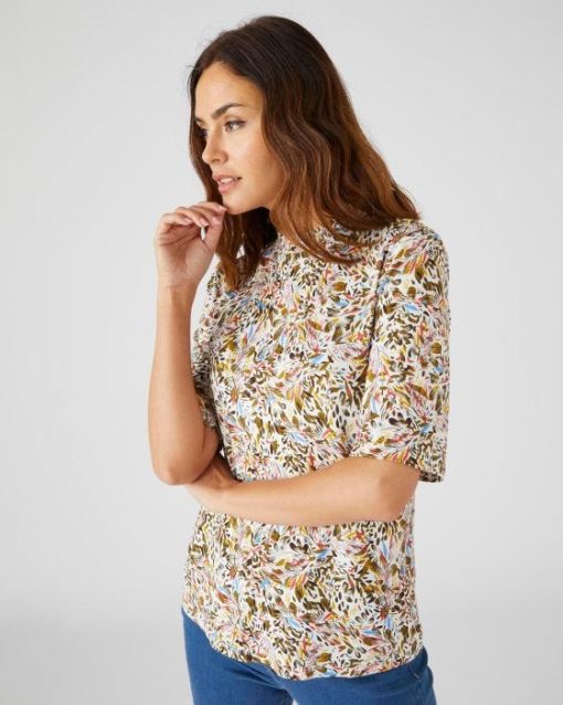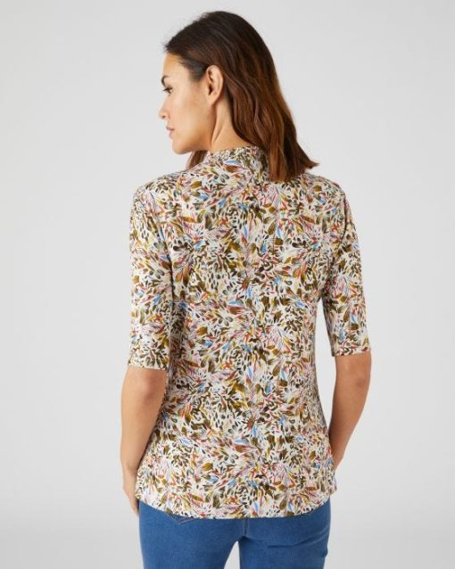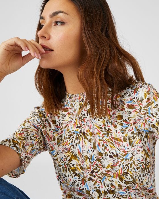 Ce tee-shirt est réalisé en viscose Lenzing(TM) EcoVero(TM) moins gourmande en eau qu’une viscose classique. Vous aimerez sa coupe fluide, douce et extensible très confortable sur un imprimé floral. Col montant souligné de détails smockés. Manches courtes revisitées dans une nouvelle longueur allant jusqu’aux coudes. Longueur du tee-shirt femme 61 cm environ.