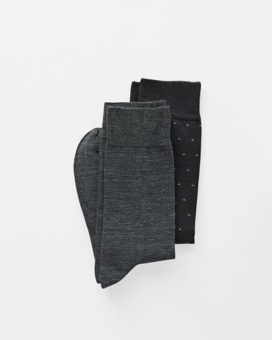 Lot de 2 paires de chaussettes homme de même taille et de coloris assortis : une paire à petits motifs, une paire unie. Se décline dans une maille chaude et douce à base de laine Mérinos. Finition bord-côtes en haut de tige. Talon et pointe renforcés.