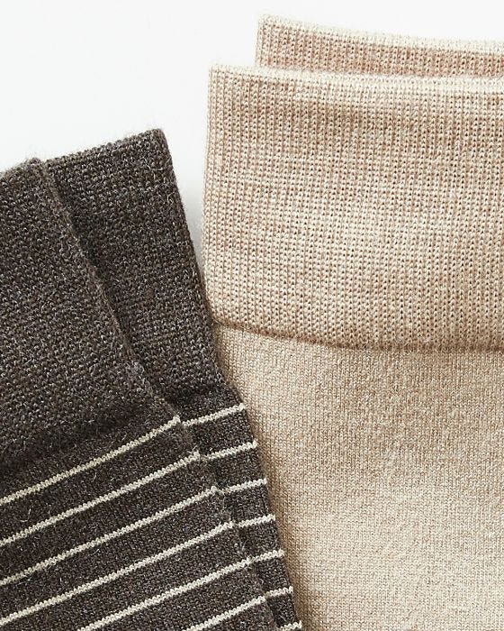 Lot de 2 paires de chaussettes fantaisie homme de même taille et de coloris assortis : une paire en uni chiné et une paire à rayures. Se déclinent dans la chaleur confortable d’un mélange Thermolactyl avec 12% de soie. Finition larges bord-côtes en haut de tige. Talons et pointes renforcés.