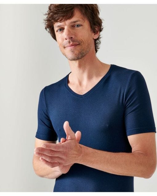 Actuel et discret sous vos tenues, ce t-shirt manches courtes en maille jersey est léger et très doux. Son mélange de matières innovant, associé à l’élasthanne, maintient l’hydratation naturelle de la peau*. Effet seconde peau, ce sous-vêtement Thermolactyl procure une chaleur optimale. Biais rapporté au col V. Longueur du t-shirt homme 67 cm environ. Passe au sèche-linge. *de l’épiderme, résultats après 4 heures de port sur panel de 117 personnes (2019-2023), tous produits de la gamme Sensitive confondus. Chaleur Soft 2 : chaleur douce, parfaite à la mi-saison. ŒKO-TEX® STANDARD 100 CQ1194/4 – IFTH.