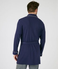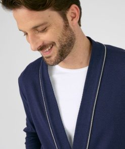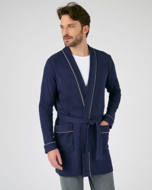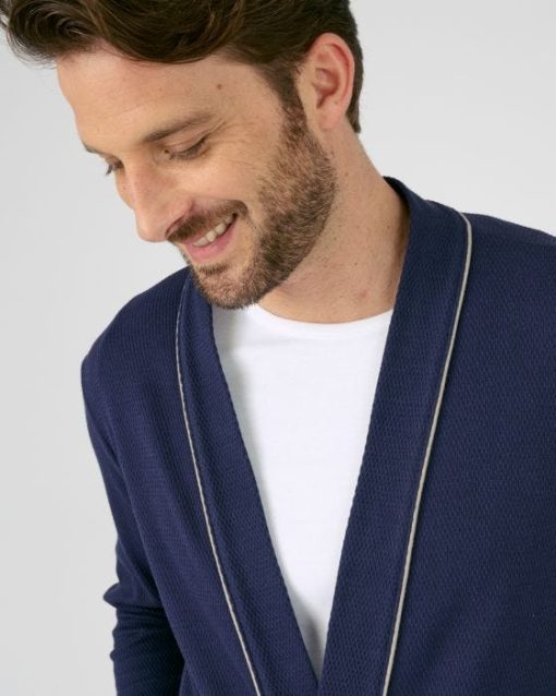 Élégante robe de chambre en maille nid d’abeille coton-polyester à la fois confortable, douce et légère. Col châle. Forme croisée. Ceinture sous passants à nouer. Manches longues. 2 poches plaquées. Longueur de la robe de chambre homme 90 cm env. ŒKO-TEX® STANDARD 100 CQ1194/1- IFTH.