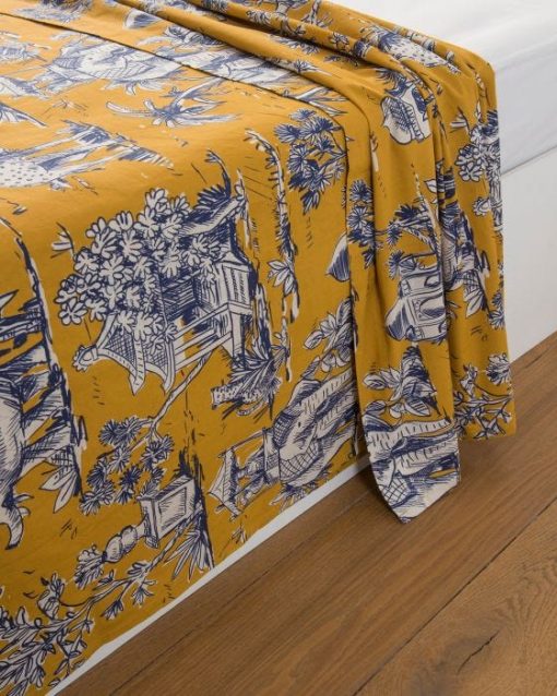 Un drap plat de dessus en pur coton au tissage serré 57 fils/cm2. Lavable à 40°. Se décline dans un imprimé à motifs safari sur un fond jaune curry. À coordonner au linge de lit de la même parure Pondichéry : drap-housse, taie de traversin, taie d’oreiller et housse de couette.
